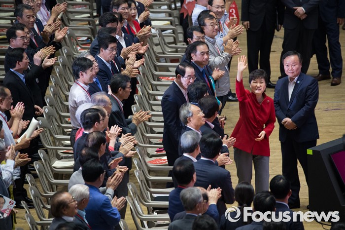 (서울=포커스뉴스) 박근혜 대통령이 9일 오후 서울 송파구 잠실실내체육관에서 제4차 새누리당 전당대회에 입장하며 당-원내대표 후보자들과 인사를 나누고 있다.