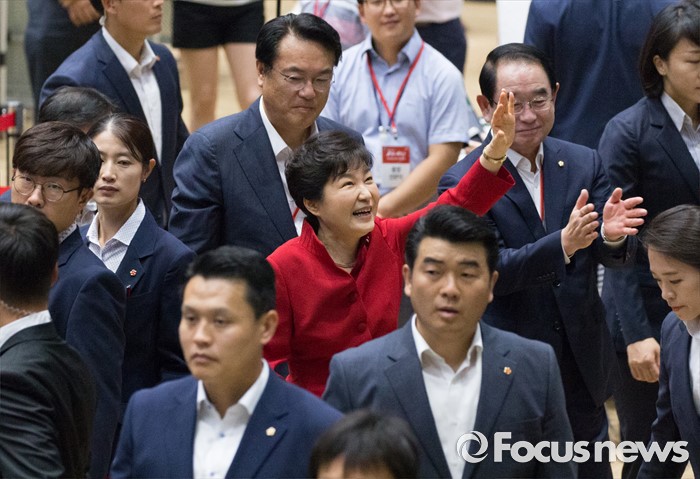 당원들에게 인사하는 박 대통령