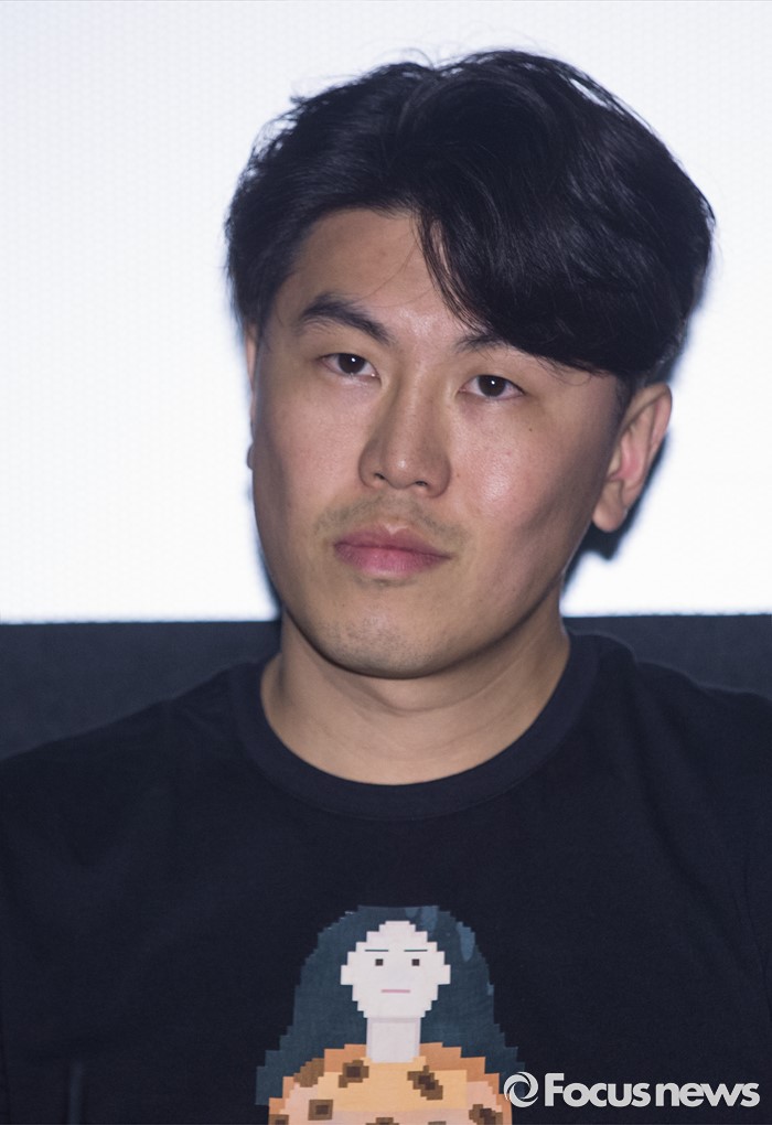 (서울=포커스뉴스) 9일 오후 서울 동작구 아트나인에서 열린 영화 '시발, 놈 : 인류의 시작' 언론시사회에 참석한 배우 손이용이 취재진에게 질문을 받고 있다.