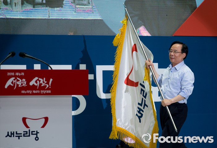(서울=포커스뉴스) 9일 오후 서울 송파구 잠실실내체육관에서 열린 새누리당 4차 전당대회에 참석한 이주영 당대표 후보가 정견발표 중 당기를 가져오고 있다.