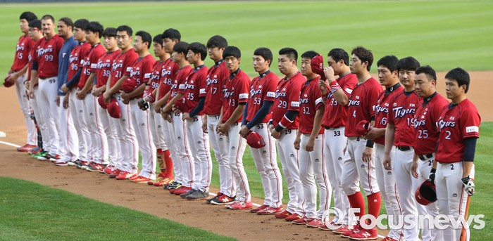 (서울=포커스뉴스) 9일 서울 잠실구장에서 열린 2016 프로야구 KIA-두산 경기에 앞서 최근 승부조작 파문에 프로야구선수협회 모든 선수가 그라운드에 도열해 야구팬에게 다시는 이러한 일이 없도록 다짐하고 사죄의 인사를 했다. KIA 선수들이 도열해 있다