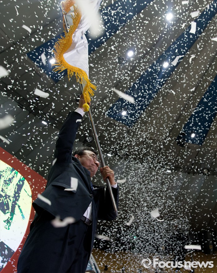 (서울=포커스뉴스) 9일 오후 서울 송파구 잠실실내체육관에서 열린 제4차 새누리당 전당대회에서 당대표로 선출된 이정현이 당기를 흔들어보이고 있다.