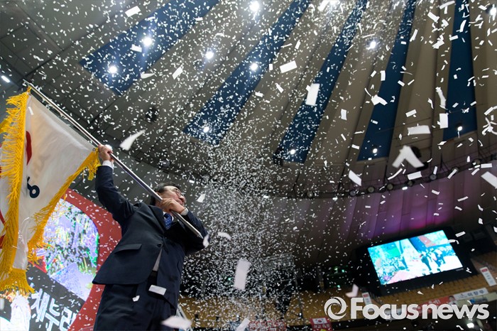 (서울=포커스뉴스) 9일 오후 서울 송파구 잠실실내체육관에서 열린 제4차 새누리당 전당대회에서 당대표로 선출된 이정현이 당기를 흔들어보이고 있다.