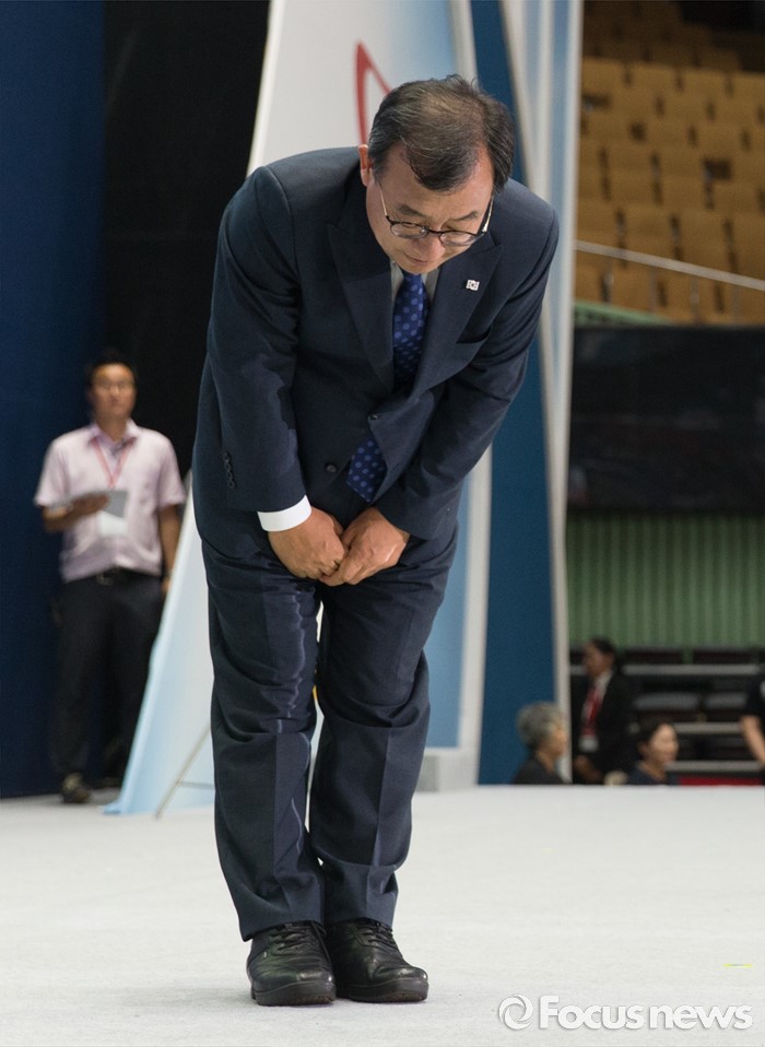 (서울=포커스뉴스) 9일 오후 서울 송파구 잠실실내체육관에서 열린 제4차 새누리당 전당대회에서 당대표로 선출된 이정현이 수락연설에 앞서 당원들에게 인사를 하고 있다.