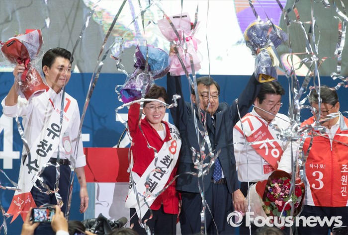 (서울=포커스뉴스) 9일 오후 서울 송파구 잠실실내체육관에서 열린 새누리당 4차 전당대회에서 당대표로 선출된 이정현 의원과 신임 최고위원들이 인사하고 있다. 왼쪽부터 유창수, 최연혜 신임 최고위원, 이정현 신임 대표, 강석호, 조원진 신임 최고위원.