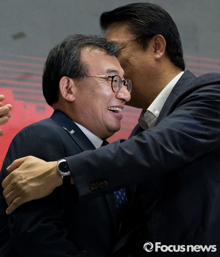 (서울=포커스뉴스) 9일 오후 서울 송파구 잠실실내체육관에서 열린 제4차 새누리당 전당대회에서 당대표로 선출된 이정현(왼쪽) 의원이 정진석 원내대표의 축하를 받고 있다.