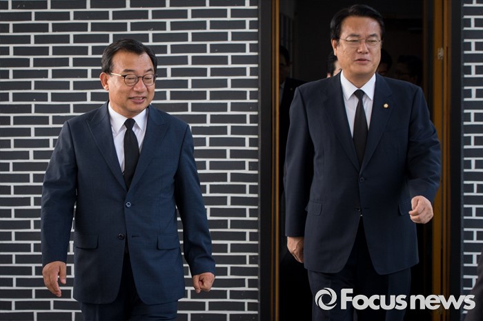 (서울=포커스뉴스) 8·9 전당대회에서 새누리당 대표로 선출된 이정현(왼쪽) 대표와 정진석 원내대표가 10일 오전 서울 동작구 국립현충원 참배단으로 향하고 있다.