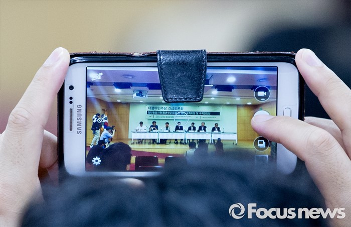 (서울=포커스뉴스) 10일 오전 서울 여의도 국회 의원회관에서 열린 더불어민주당 청년지원사업(청년수당)으로 본 청년 구직지원 및 구직안전망 긴급토론회에 자리한 한 참석자가 토론회 모습을 촬영하고 있다.