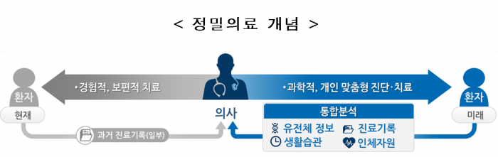 정밀의료는 유전체 정보, 진료·임상정보, 생활습관정보 등을 통합 분석해 환자 특성에 맞는 적합한(맞춤형) 의료서비스를 제공하는 것으로, 진료의 정확도와 치료 효과를 동시에 높일 수 있는 새로운 의료 패러다임이다.