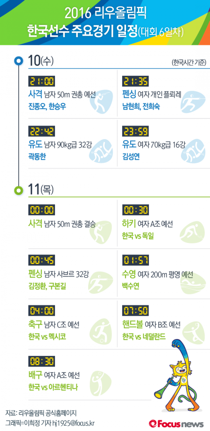 | △ [그래픽] 2016 리우올림픽 한국선수 주요경기 일정(대회6일차) |