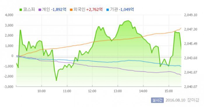 이날 코스피는 전일 대비 0.04% 하락한 2043.03으로 장을 시작했다. 이후 지수는 개인과 기관의 동반 매도세에 2040선 부근에서 등락을 반복했다. 그러나 장 중반 외국인의 사자세가 강화되면서 장중 2049.36까지 올라섰다.