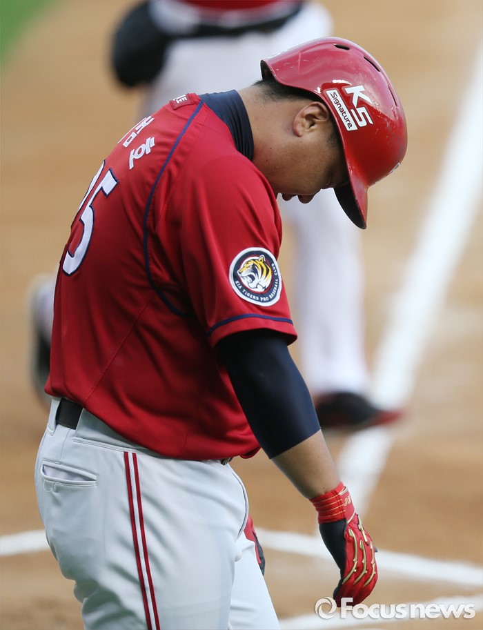 볼에 맞고 나가는 KIA 이범호