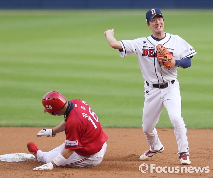(서울=포커스뉴스) 10일 서울 잠실구장에서 열린 2016 프로야구 KIA-두산 경기 1회초 무사 1,2루에서 두산 유격수 김재호가 KIA 나지완의 2루 땅볼때 1루주자 김주찬을 2루에서 포스아웃시키고 1루로 송구하고 있다. 병살플레이 성공.