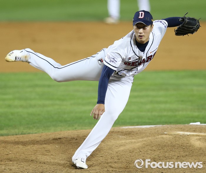 (서울=포커스뉴스) 10일 서울 잠실구장에서 열린 2016 프로야구 KIA-두산 경기 6회초 2사 만루에서 구원 등판한 두산 투수 고봉재가 KIA 나지완을 상대로 투구하고 있다.