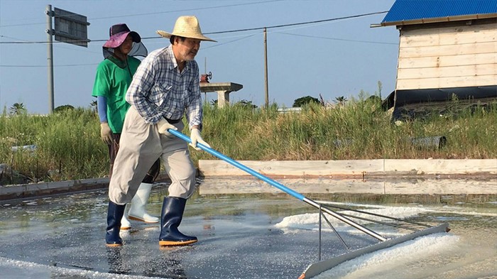 (서울=포커스뉴스) 전국 민심투어를 재개한 김무성 새누리당 전 대표가 10일 오후 전남 신안군 하의도를 방문해 염전 체험을 하고 있다. <사진제공=김무성 전 대표 페이스북>