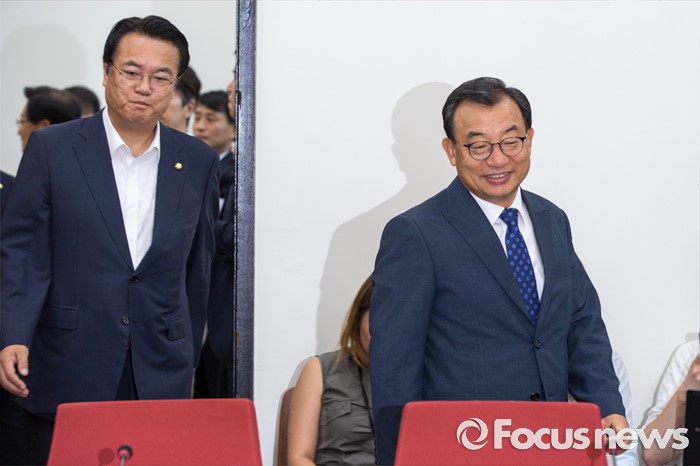 (서울=포커스뉴스) 이정현(오른쪽) 새누리당 대표와 정진석 원내대표가 11일 오전 서울 여의도 국회에서 열린 최고위원회의에 참석하기 위해 회의실로 들어서고 있다. 이날 회의에서 대표와 원내대표를 비롯한 최고위원들의 모두발언 공개 없이 잠깐의 촬영시간만 주어진 뒤 비공개로 전환 했다.