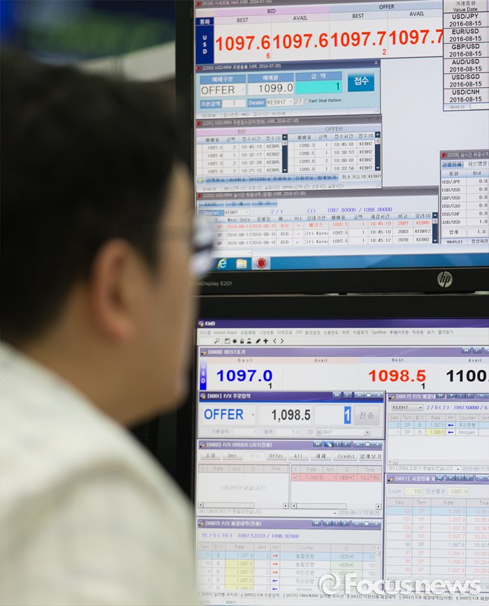 (서울=포커스뉴스) 11일 오전 서울 중구 KEB 하나은행 딜링룸에서 한 딜러가 업무를 보고 있다.