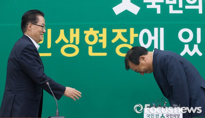 (서울=포커스뉴스) 11일 오후 서울 여의도 국회에서 박지원(왼쪽) 국민의당 비상대책위원장이 이정현 새누리당 대표와의 면담에 앞서 인사하고 있다.
