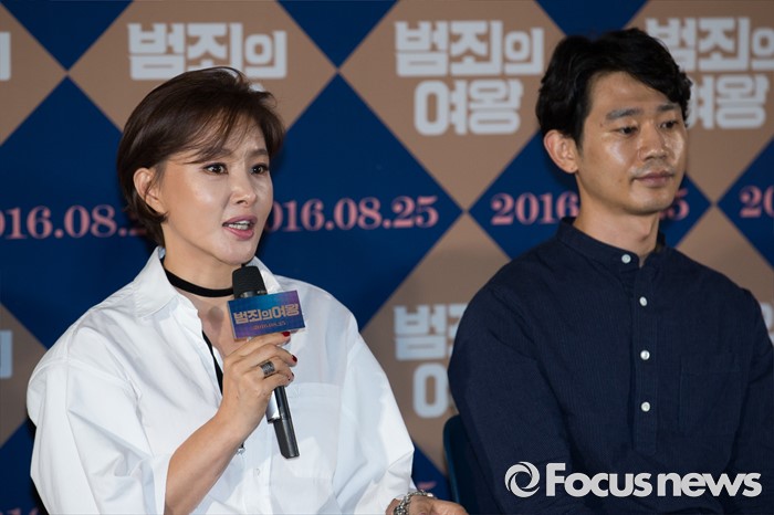 (서울=포커스뉴스) 11일 오후 서울 성동구 CGV 왕십리에서 열린 영화 '범죄의 여왕' 언론시사회에 참석한 배우 박지영이 취재진 질문에 답변하고 있다. 오른쪽은 배우 김대현.