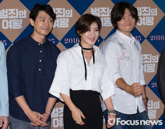 (서울=포커스뉴스) 11일 오후 서울 성동구 CGV 왕십리에서 열린 영화 '범죄의 여왕' 언론시사회에 참석한 배우 박지영(왼쪽부터), 김대현, 조복래가 포즈를 취하고 있다.