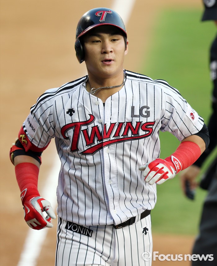 | △ 선제 솔로 홈런치고 홈인하는 오지환 |