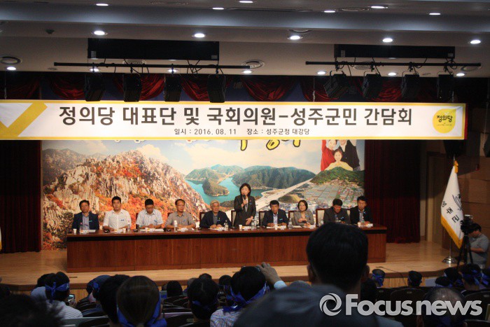 (성주=포커스뉴스) 10일 오후 성주군청 대회의실에서 열린 성주군민 간담회에 참석한 심상정 정의당 상임대표가 인사말을 하고있다.