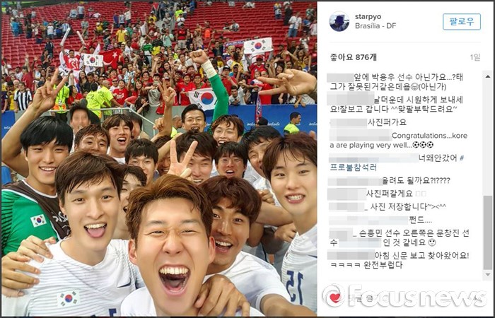 (서울=포커스뉴스) 대한민국 축구대표팀이 10일(현지시각) 브라질 브라질리아 마네 가힌샤 경기장에서 열린 리우올림픽 축구 C조 조별리그 3차전 멕시코와의 경기에서 8강행을 결정지은 후 관중의 휴대폰을 빌려 찍은 셀카에서 밝게 웃으며 승리를 자축하고 있다. <사진출처=starpyo 인스타그램 캡쳐>